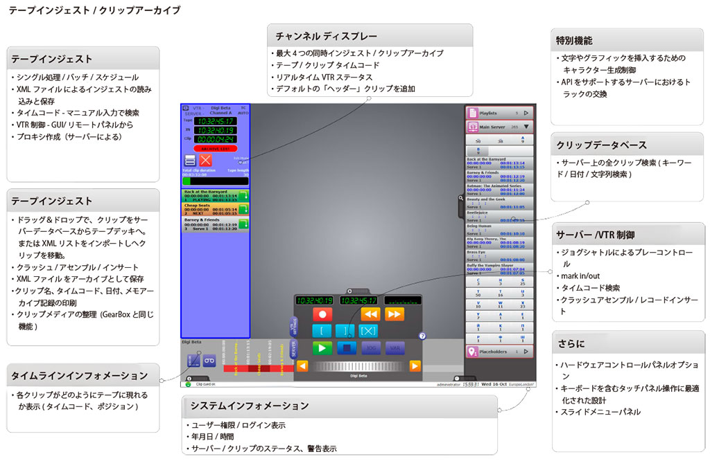 • 標準サーバー、ディスク、VTR、特定API向けの統合制御モジュール(ネットワークまたはシリアルインターフェース経由)
