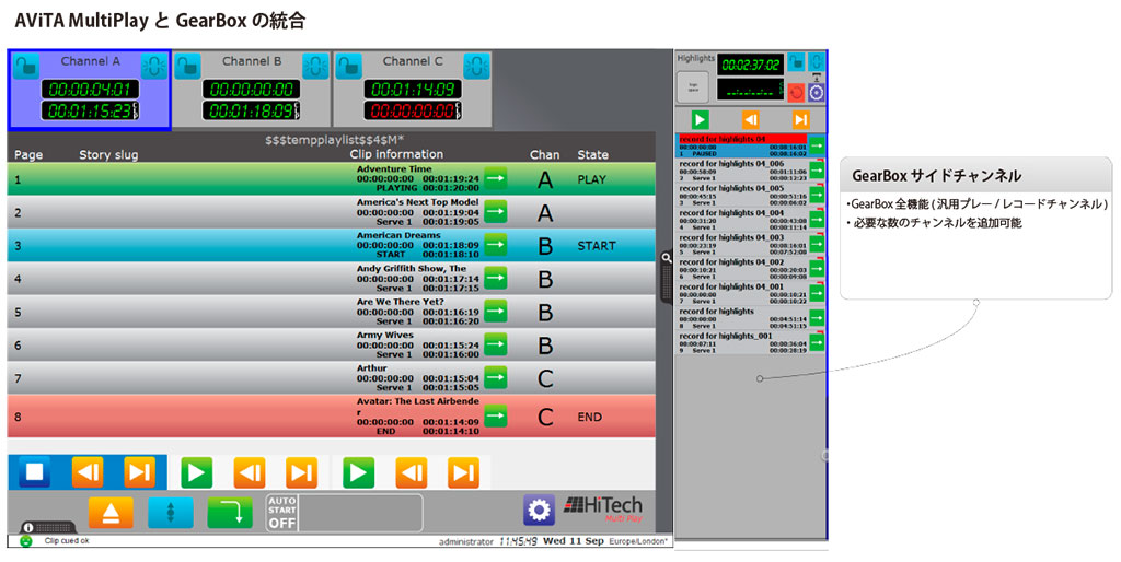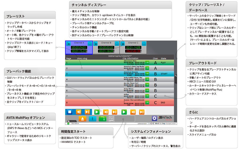 Hi Tech SystemsのAViTAシリーズ MultiPlayは、ニュース運用でオンエア時に変更を必要とするABCDプレーリスト形式のプレー向けに設計されています。スイッチャーやルーターとの統合による無人ABCDプレーリスト方式のプレーも設定可能です。