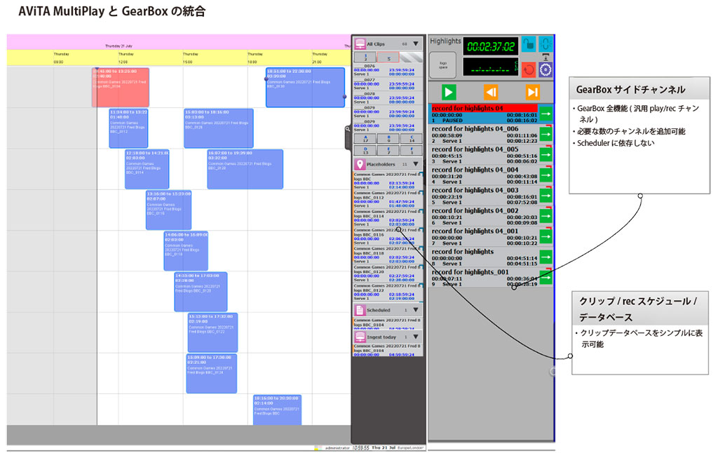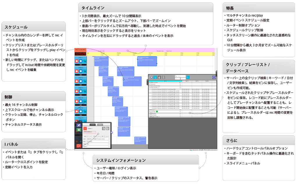 イベントを繰り返し設定する複数のスケジューリング(毎日、毎週、毎月)や、20チャンネル以上を最大3か月先までインジェスト/プレーするプログラムが可能です。