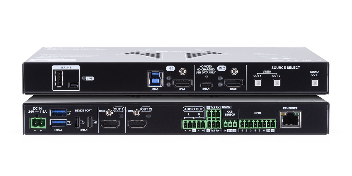 HDMI+USB-B入力x1系統、HDMI+USB-C(データのみ)入力x1系統、HDMI出力x2系統を搭載。USB 3.1 Gen1による最大5Gbpsの高速データ転送と、最大4K@60Hz(4:4:4)の高解像度映像をサポートしています。