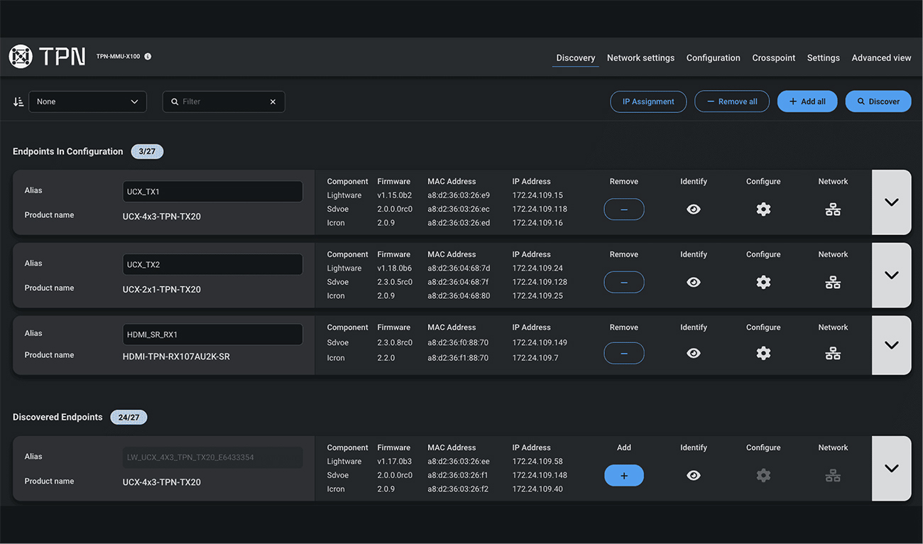 10G SDVoEネットワーク上のTPNデバイスを自動検出し、送信機・受信機・スイッチを含むトポロジーマップを生成します。IPアドレス、MACアドレス、エイリアス、ファームウェア、ステータス情報を一元表示し、導入・管理・トラブル対応を効率化します。