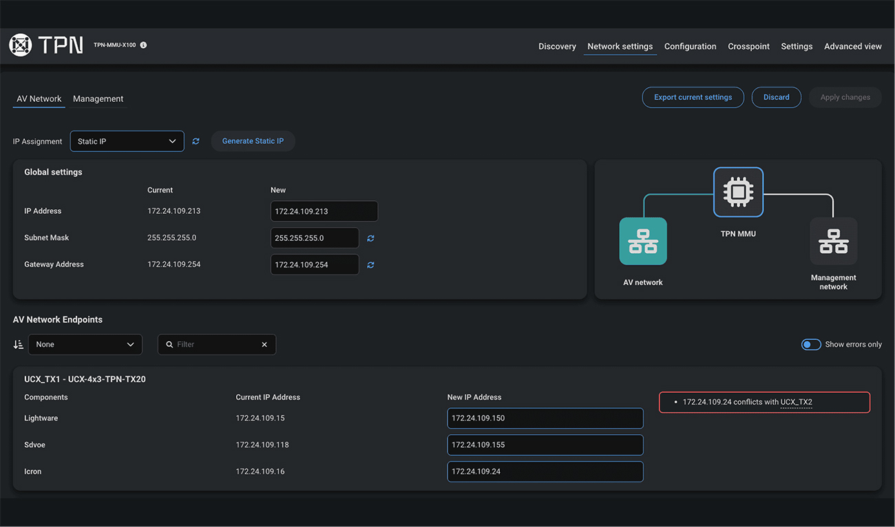 専用インターフェースから、ネットワーク/映像/シリアル設定を集中管理。AVネットワークと管理ネットワークを分離し、安全で安定したシステム構築を実現します。DHCP/固定IPの切り替えも簡単で、IP競合やサブネット不整合を検出する機能により構成ミスを防止します。
