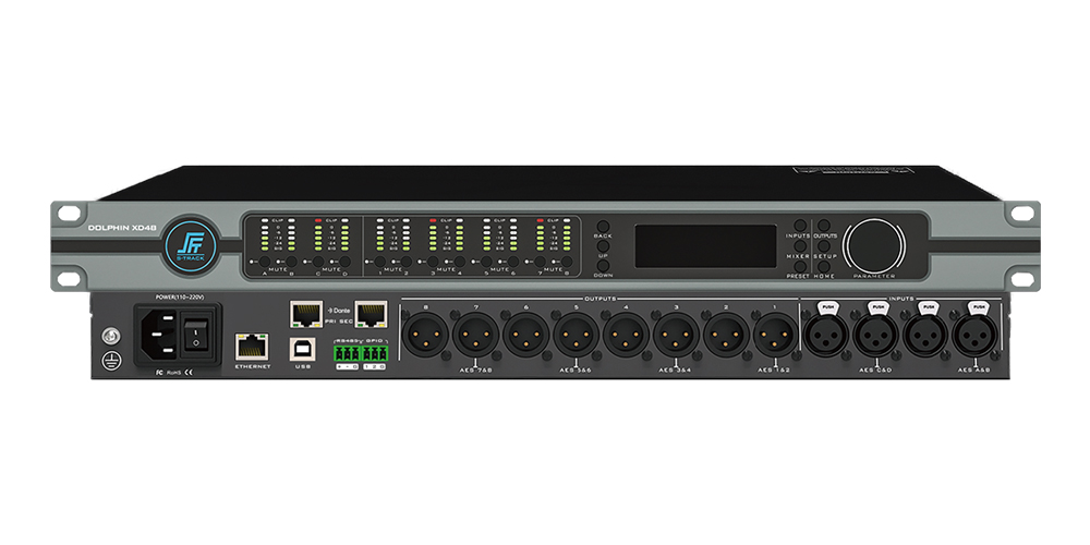 DOLPHIN Xシリーズは、マルチスピーカー制御と高精度な音響調整を必要とする現場に最適なスピーカーマネジメントプロセッサーです。入出力はアナログ(4入力/8出力)およびDante(4入力/8出力)に対応。96kHzサンプリング周波数および123dBを超えるダイナミックレンジに対応したAD/DA変換チップを搭載し、ノイズフロアを-92dBuまで低減します。また、40bit浮動小数点DSPチップを搭載し、複雑なオーディオ処理機能を提供します。