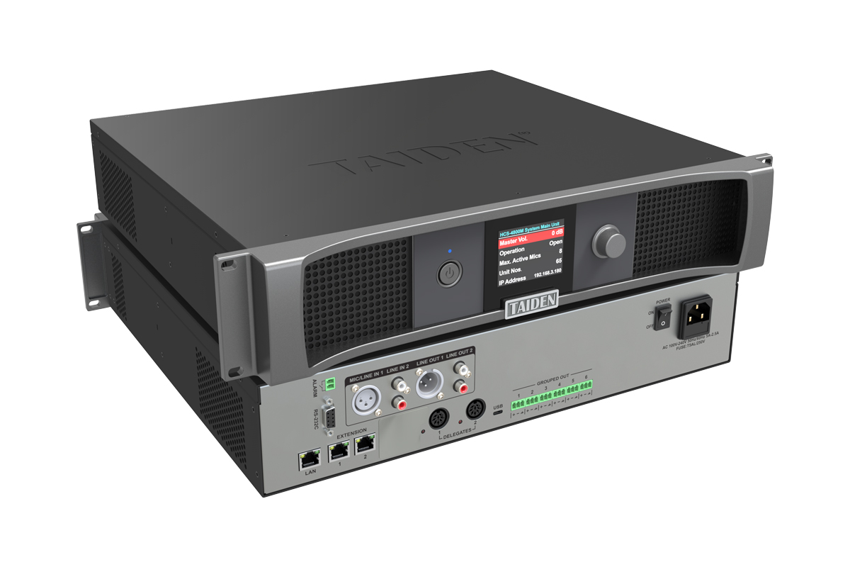 TAIDEN HCS-4800M/20は、HCS-4800シリーズ有線デジタル会議システムのメインユニットです。バックライト付き 2.8インチ LCD ディスプレイとロータリー操作による直感的な設定・状態確認が可能です。最大8本のマイクの同時発言をサポートし、オープン/オーバーライド/音声起動/発言要求/PTTなど、多彩な発言モードに対応。また、64チャンネル同時通訳および各種投票機能により、幅広い会議形態をカバーします。全モデル共通で、セカンダリーメインユニットをスタンバイ接続でき、プライマリユニット障害時には自動的に切り替わり、会議を中断させない高い冗長性を確保します。