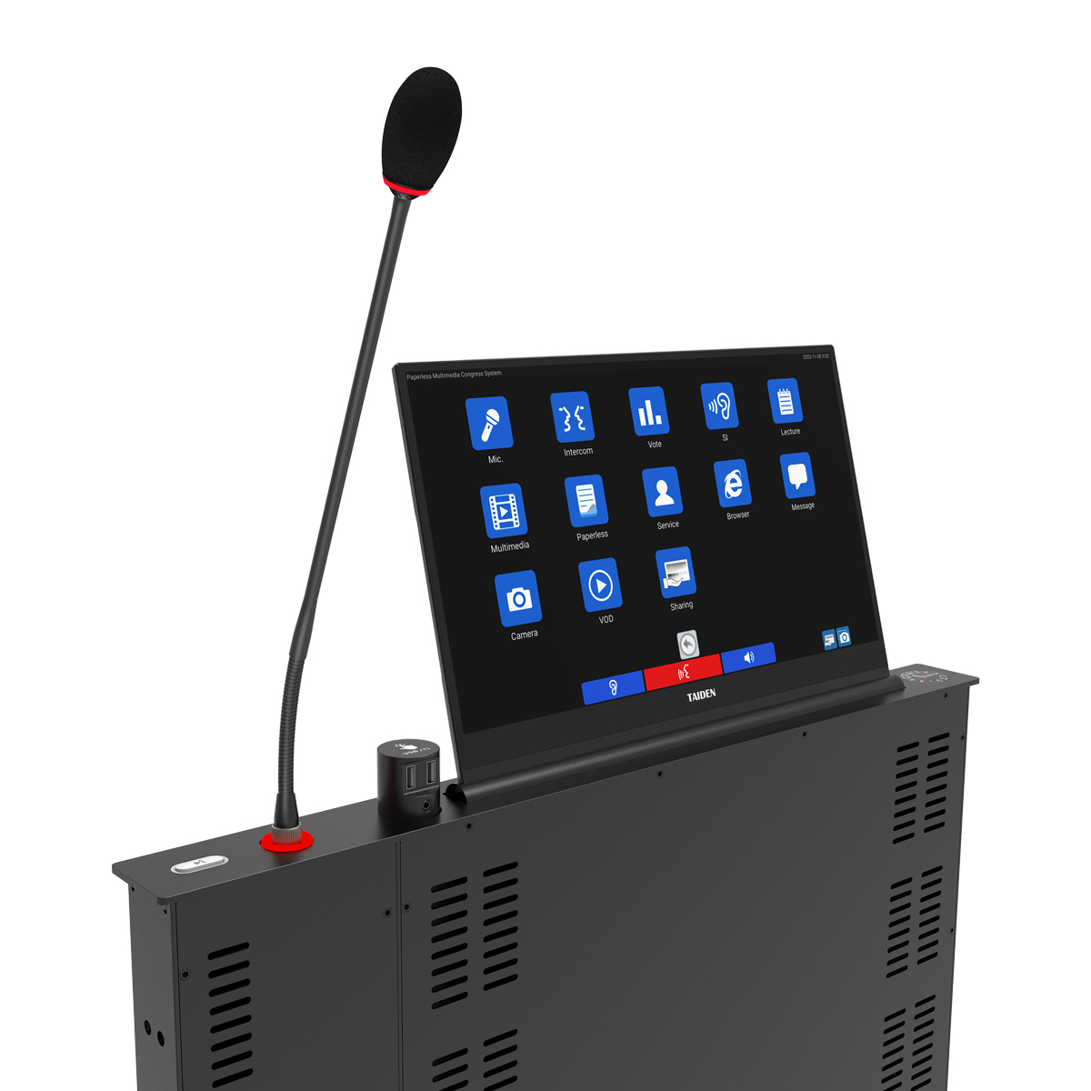 HCS-8679シリーズは、グースネックマイクとタッチスクリーンを同時に昇降させて格納可能なフラッシュマウント設計のペーパーレスマルチメディア会議ターミナルです。視認性の高い曇りガラス仕様のIPS液晶タッチパネルは2KフルHD解像度に対応し、15.6インチと17.3インチの2サイズから選択できます。タッチパネルからは、言語の切り替えや高さ調整が可能です。議長ユニットには、他のマイクを簡単にコントロールできるプライオリティボタンがあり、スムーズで効率的な会議を実現します。